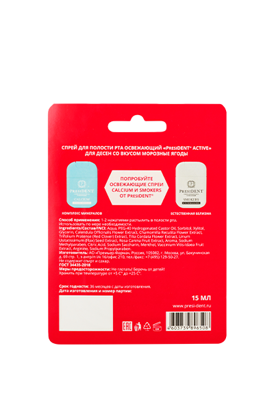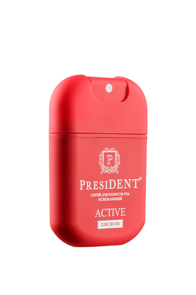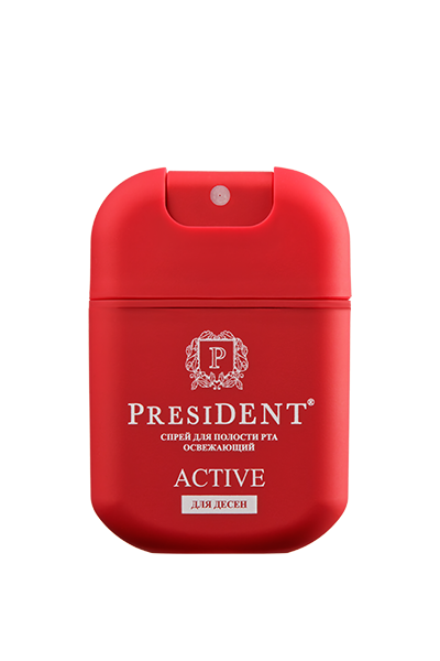 Cпрей для полости рта освежающий PRESIDENT Active для десен со вкусом морозные ягоды. Поддерживает здоровье десен, подавляет рост бактерий и освежает дыхание. Создан с использованием формулы, разработанной в Италии. Не содержит спирта и сахара. Способ применения: 1-2 нажатиями распылить в полости рта. Использовать по мере необходимости.