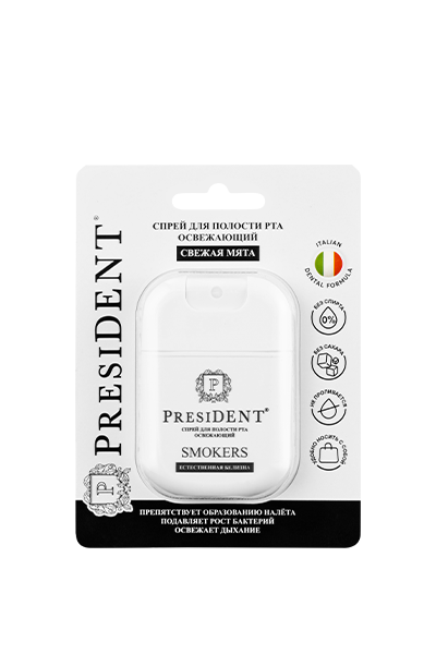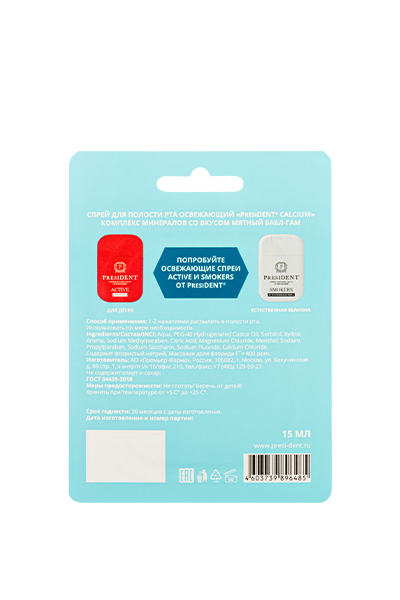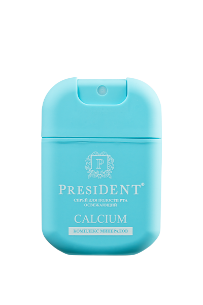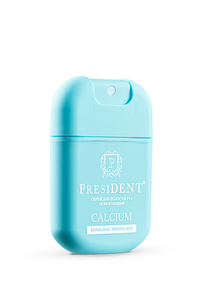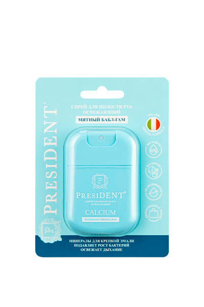 Спрей для полости рта освежающий PRESIDENT Calcium комплекс минералов со вкусом мятный бабл-гам. Содержит минералы для крепкой эмали, подавляет рост бактерий и освежает дыхание. Создан с использованием формулы, разработанной в Италии. Не содержит спирта и сахара. Способ применения: 1-2 нажатиями распылить в полости рта. Использовать по мере необходимости.