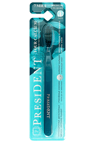 Зубная щётка PRESIDENT Four Calcium рекомендована для устранения поверхностных пятен и налёта, что помогает осветлить цвет зубной эмали без использования химических отбеливающих средств. Благодаря мягкой абразивной технологии эффективно устраняет загрязнения, возвращая зубам естественную белизну и здоровый внешний вид.