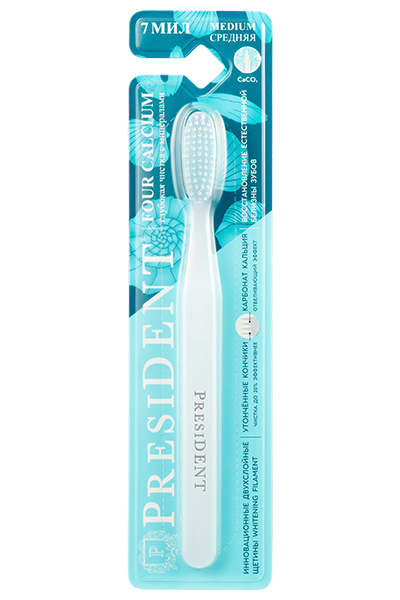 Зубная щётка PRESIDENT Four Calcium рекомендована для устранения поверхностных пятен и налёта, что помогает осветлить цвет зубной эмали без использования химических отбеливающих средств. Благодаря мягкой абразивной технологии эффективно устраняет загрязнения, возвращая зубам естественную белизну и здоровый внешний вид.