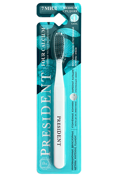 Зубную щётку Four Calcium рекомендуется применять с зубной пастой PRESIDENT® Four Calcium с RDA 50 или другой зубной пастой с RDA не выше 60–70 для ежедневного ухода.