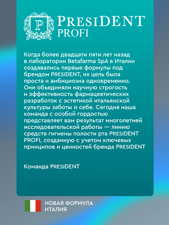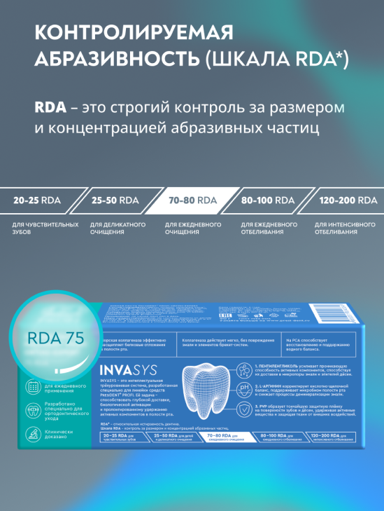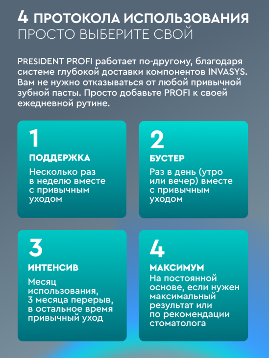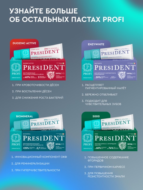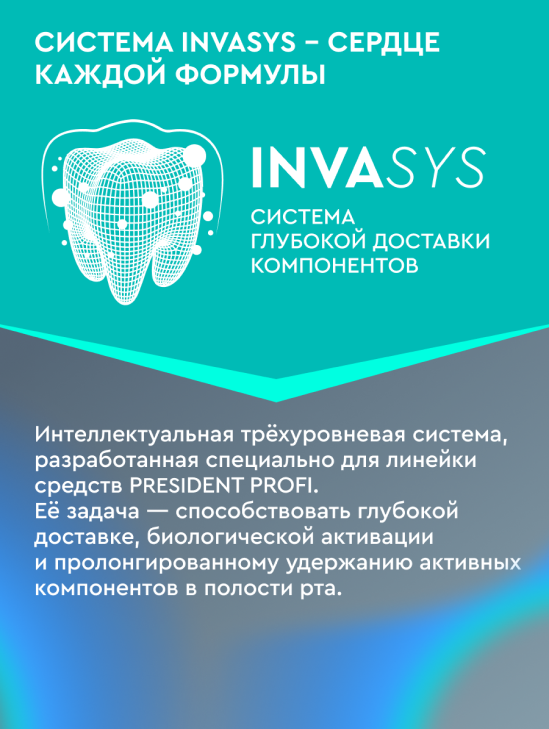 Система INVASYS — интеллектуальная трёхуровневая система, разработанная специально для линейки средств PRESIDENT PROFI. Её задача — способствовать глубокой доставке, биологической активации и пролонгированному удержанию активных компонентов в полости рта.