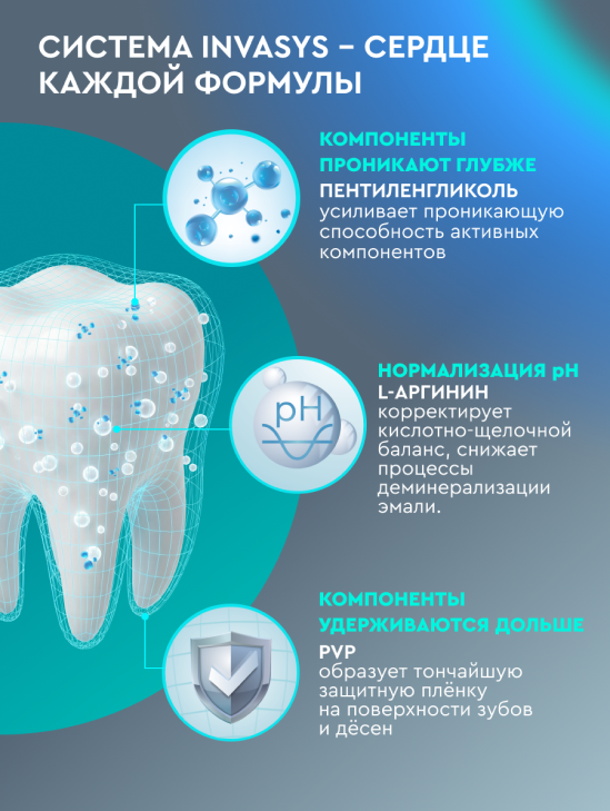 Пентиленгликоль усиливает проникающую способность активных компонентов, способствуя их доставке в микропоры эмали и эпителий дёсен