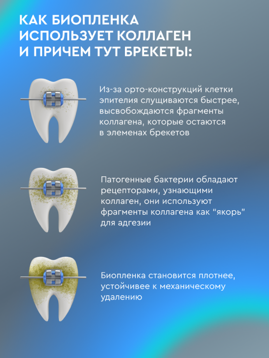 Из-за орто-конструкций клетки эпителия слущиваются быстрее высвобождаются фрагменты коллагена,которые остаются в элеменах брекетов